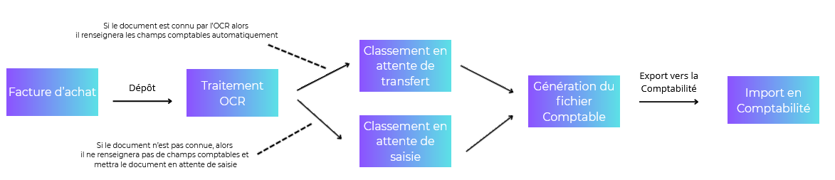 Cela permet dans le cas des documents d'achats, que le fournisseur envoi ça facture, le document est intégré dans Zeendoc, via l'OCR le document est analysé et vient renseigné les informations comptables dans le cas d'une facture récurente par exemple, et en suite le document peut être transféré en comptabilité.