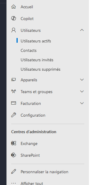 Se connecter via Keeper au compte ADM 365 de la société concernée, puis, une fois connecté, cliquer sur Admin en bas de la colonne de gauche.