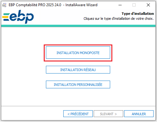 L'installation monoposte permets d'installer à la fois le logiciel EBP ainsi que le moteur SQL afin que vous puissiez avoir le logiciel ainsi que la base de données sur le même poste sans avoir une motion de multi-utilisateurs.